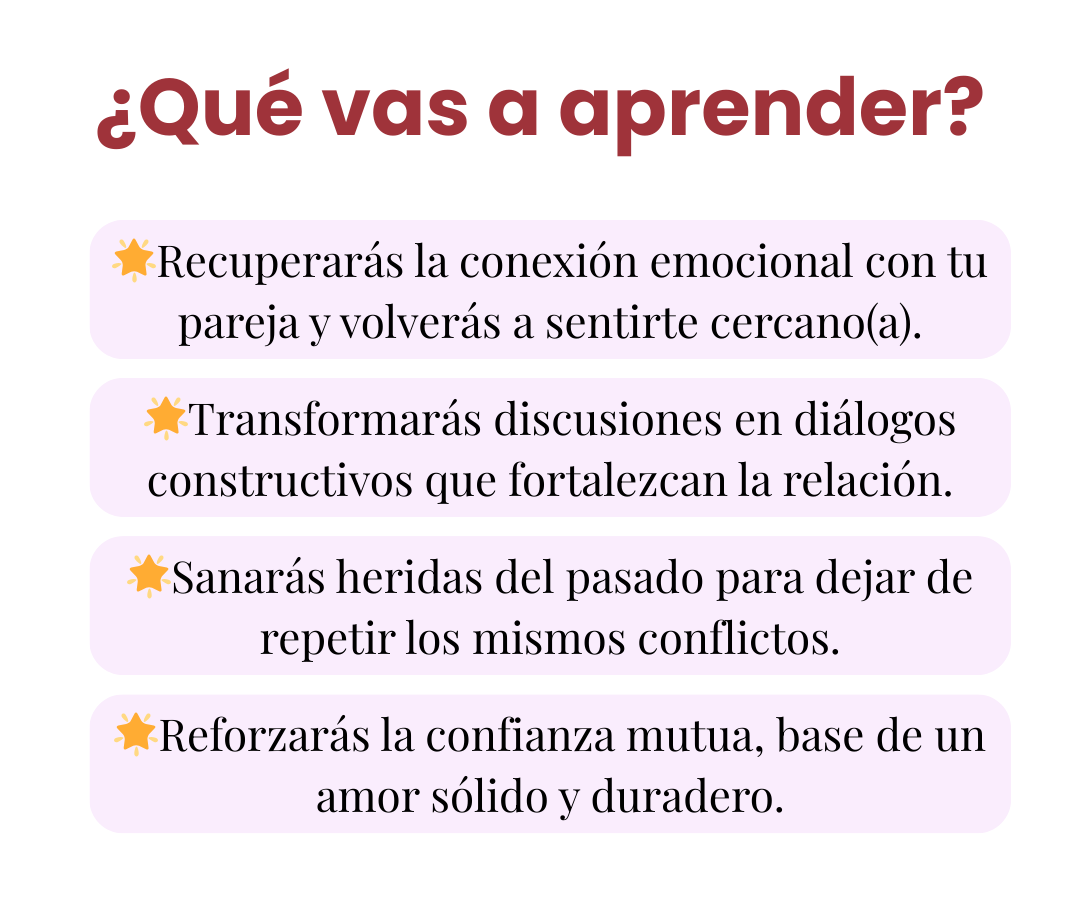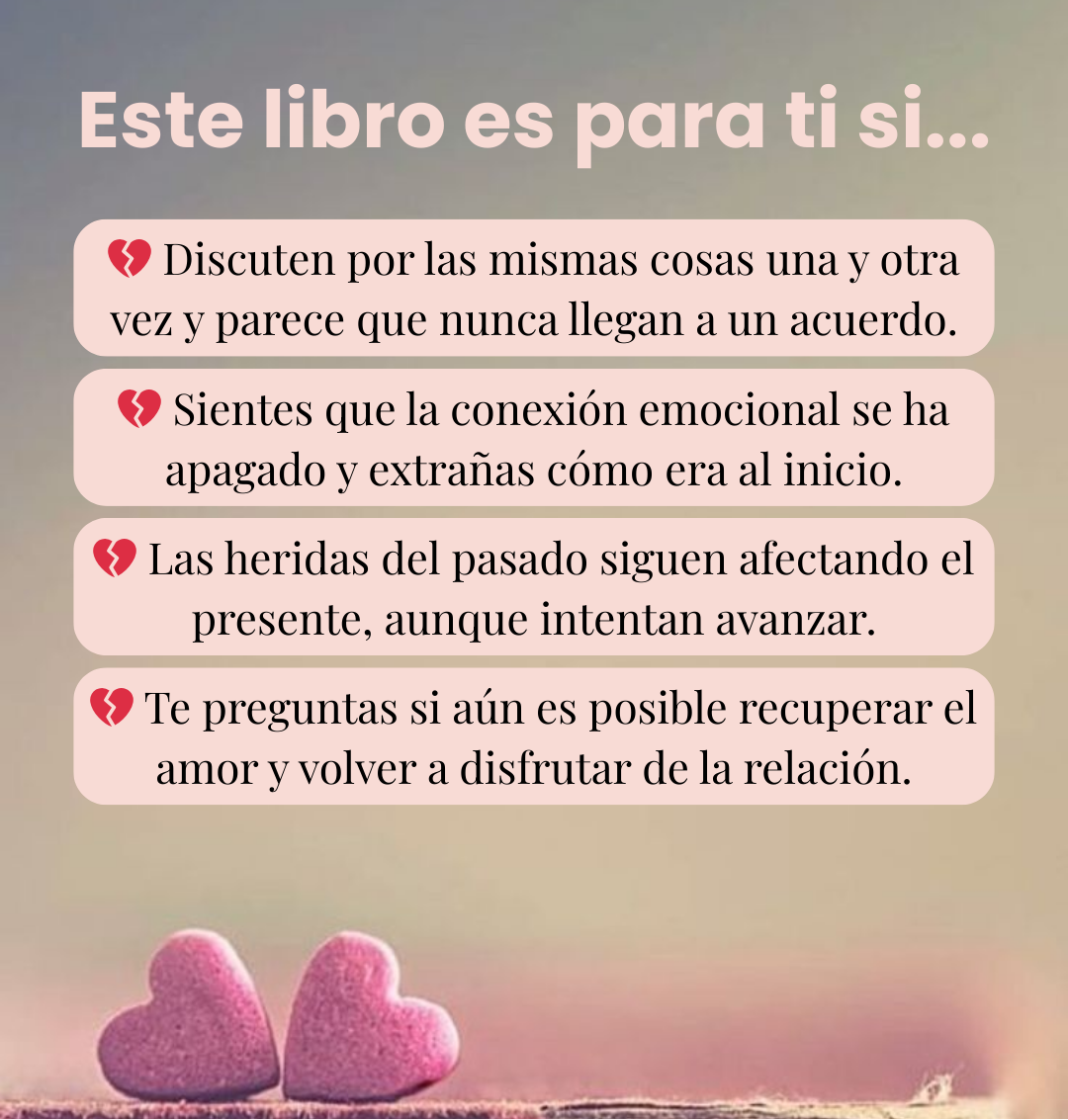 Gran pregunta 🙌. Aunque lo ideal es que ambos lo lean, Sanar en Pareja está escrito para que puedas iniciar cambios tú mismo/a. Muchas veces basta con que uno comience a sanar y aplicar los ejercicios para que la relación empiece a transformarse.